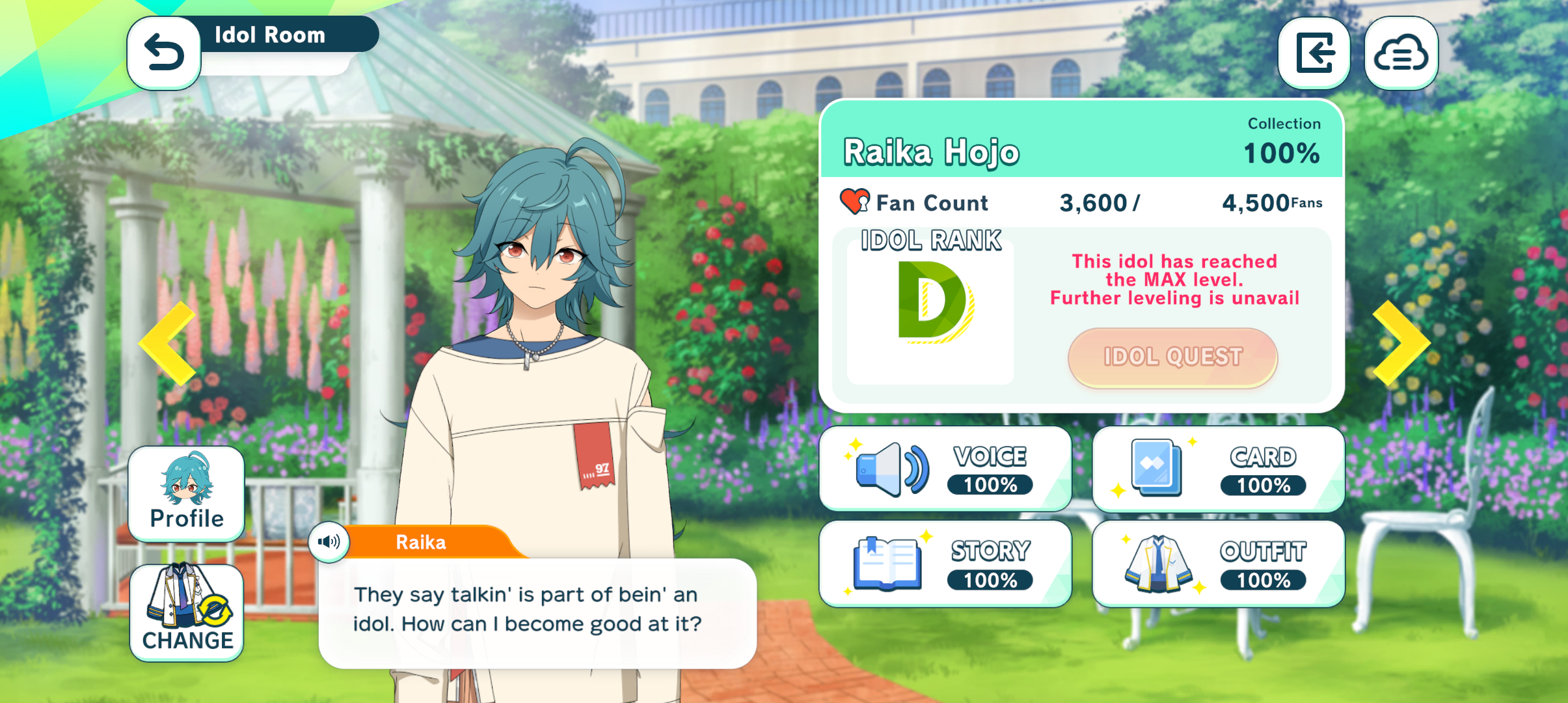 100% Raika completion!!!!!I didn't quite max his fans yet so I can keep dragging him around for work, since I also wanna get his office stats up as much as possible. I'm just so excited he's finally here in eng *w*